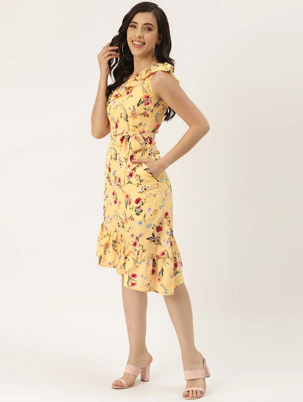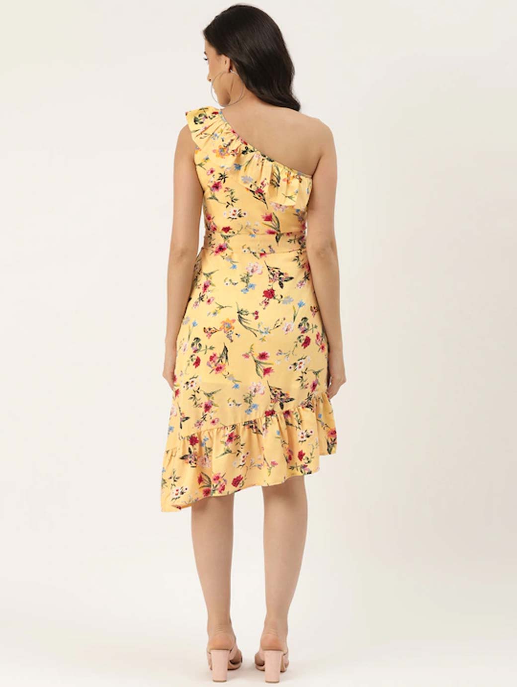 Beige and red floral print a-line dress, One shoulder, Sleeveless, no sleeves, Ruffled detail, Knee length in flounce hem, Concealed zip closure, Comes with a belt.