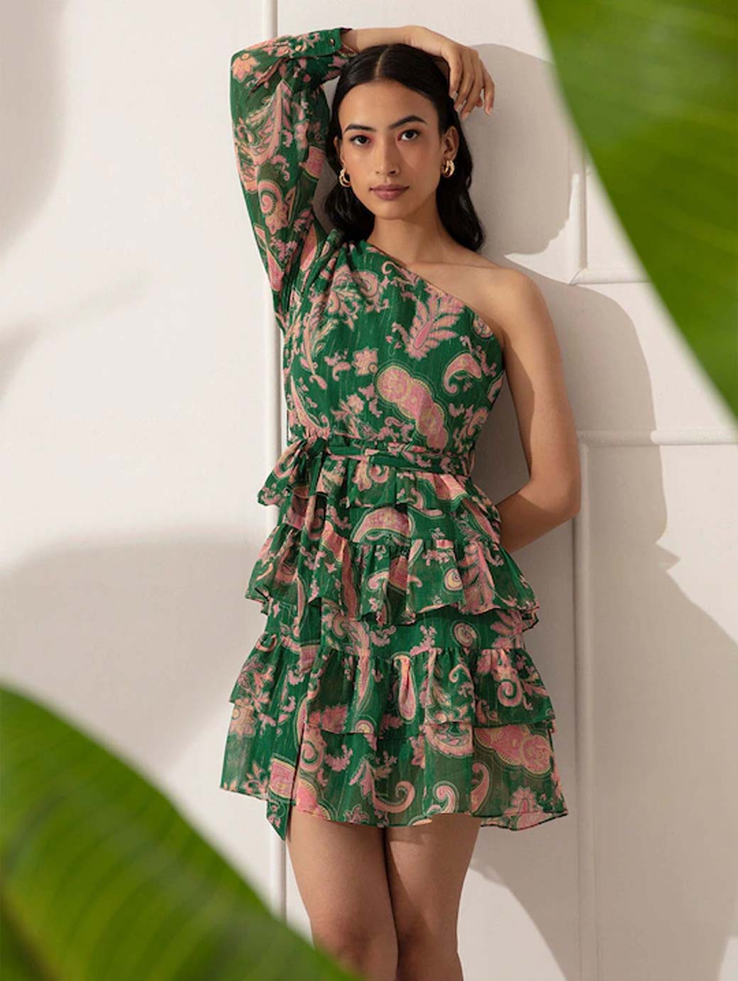 Green and pink floral print fit & flare dress One shoulder Long, regular sleeves Above knee length in flounce hem Chiffon fabric Concealed zip closure