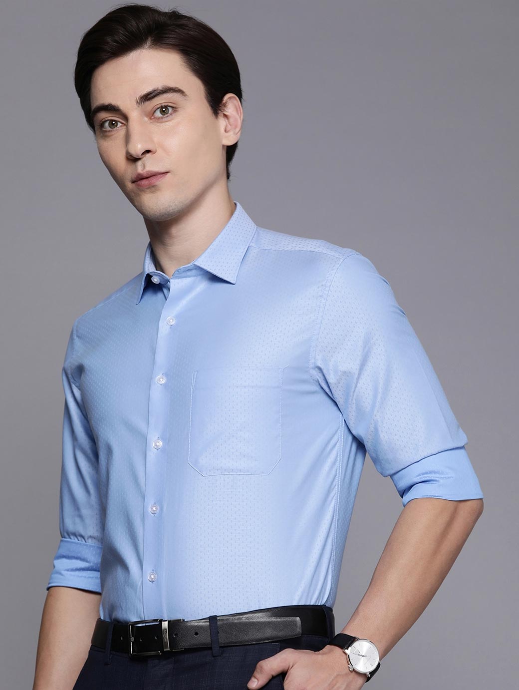 Blue  printed Formal shirt ,has a spread collar, button placket, 1 patch pocket, long regular sleeves, curved hem