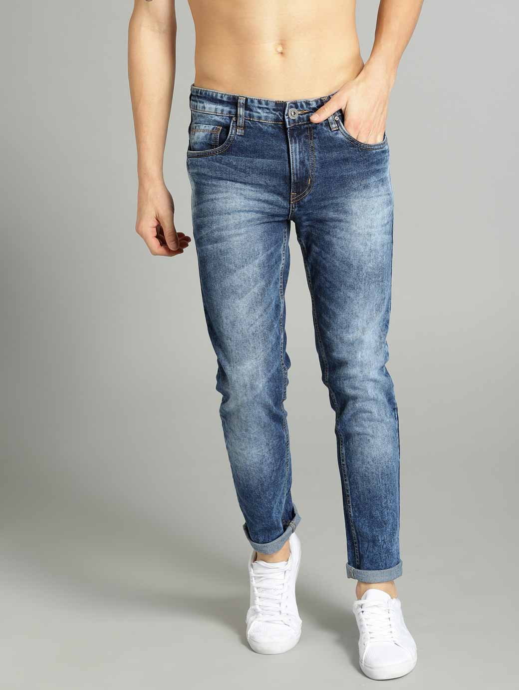 Blue medium wash 5-pocket mid-rise jeans, clean look with light fade, has a button and zip closure, waistband with belt loops