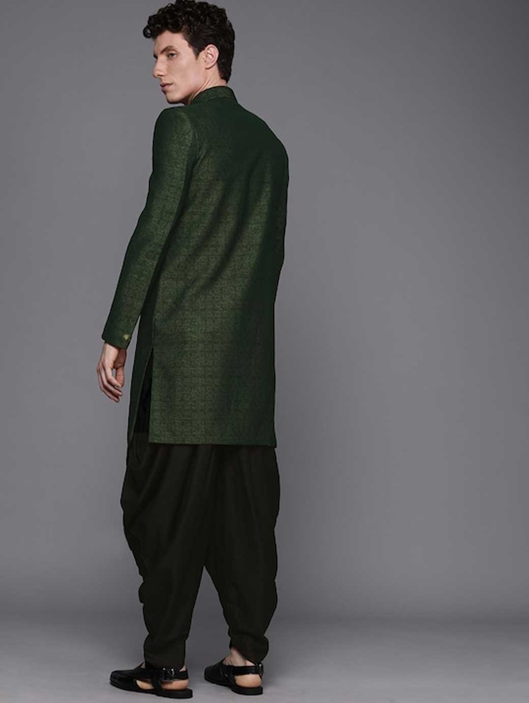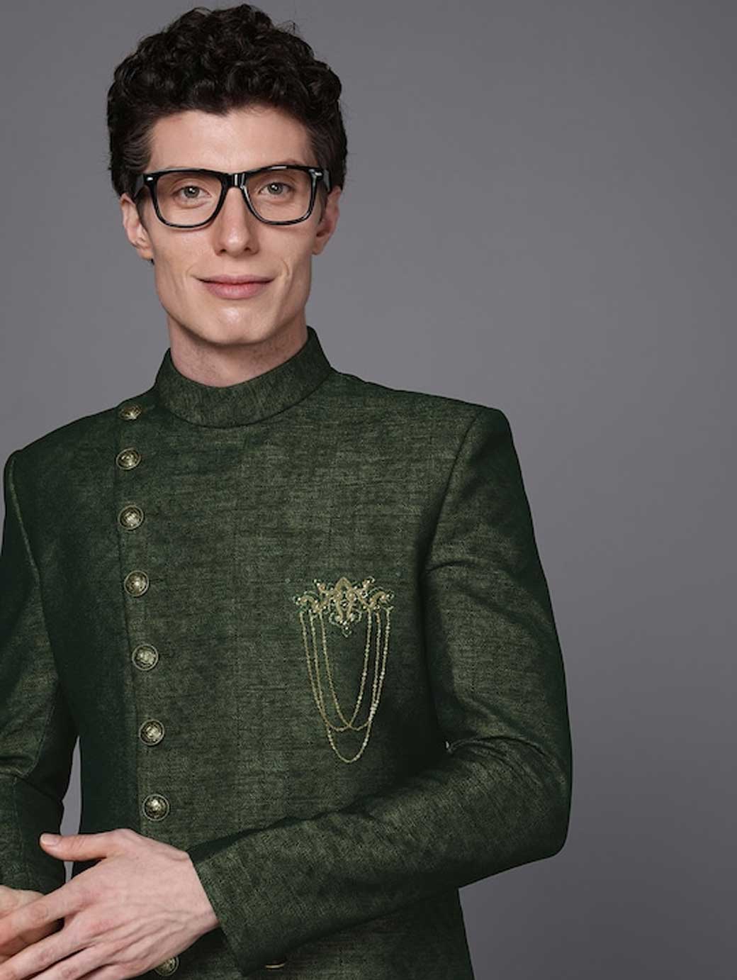 Complete The Look proudly presents a wide range of fusion wear for men and this exceptional dark green attire is a must-have. The contemporary green indo-western is a unique style that instantly gets you all compliments.