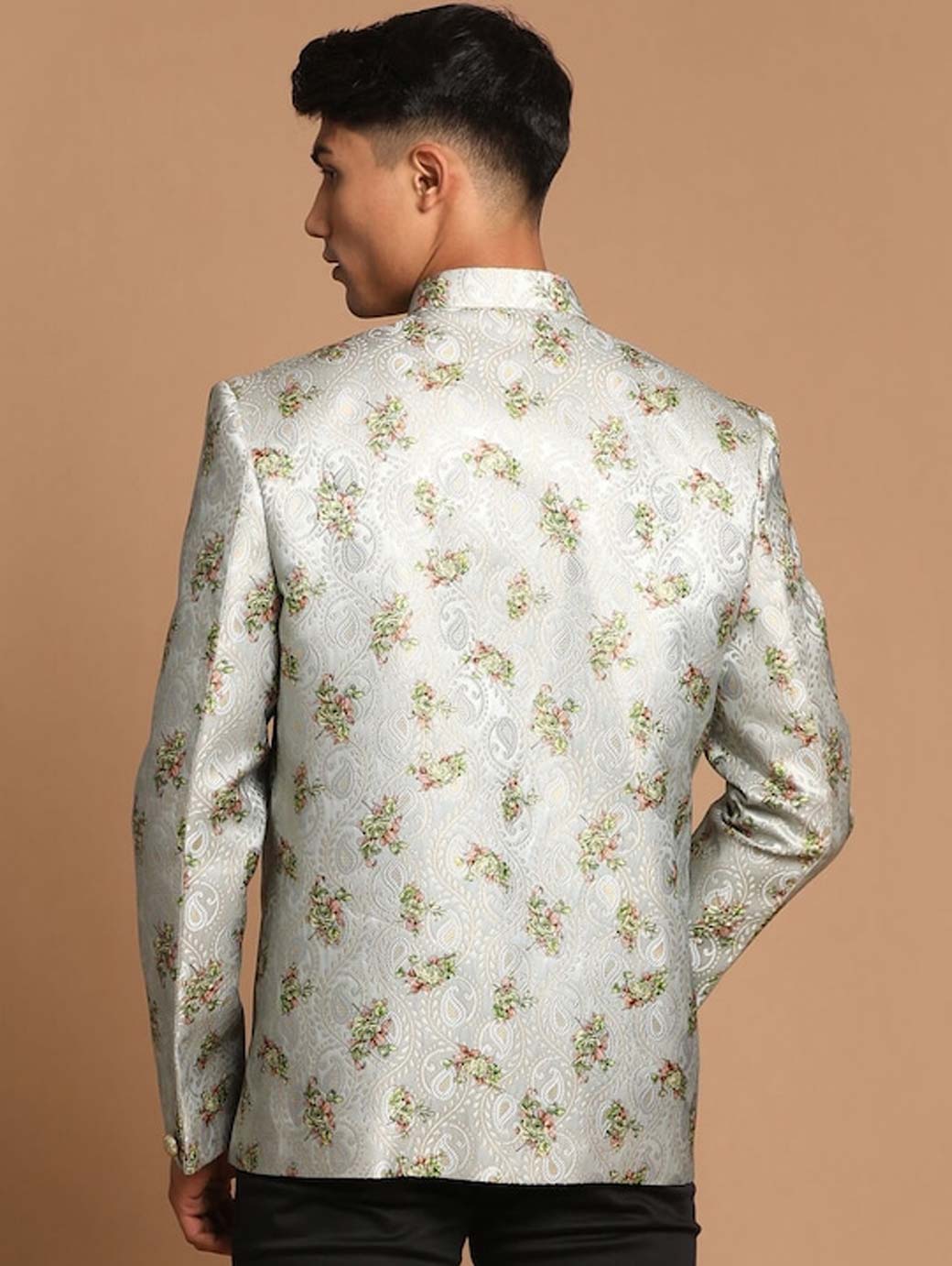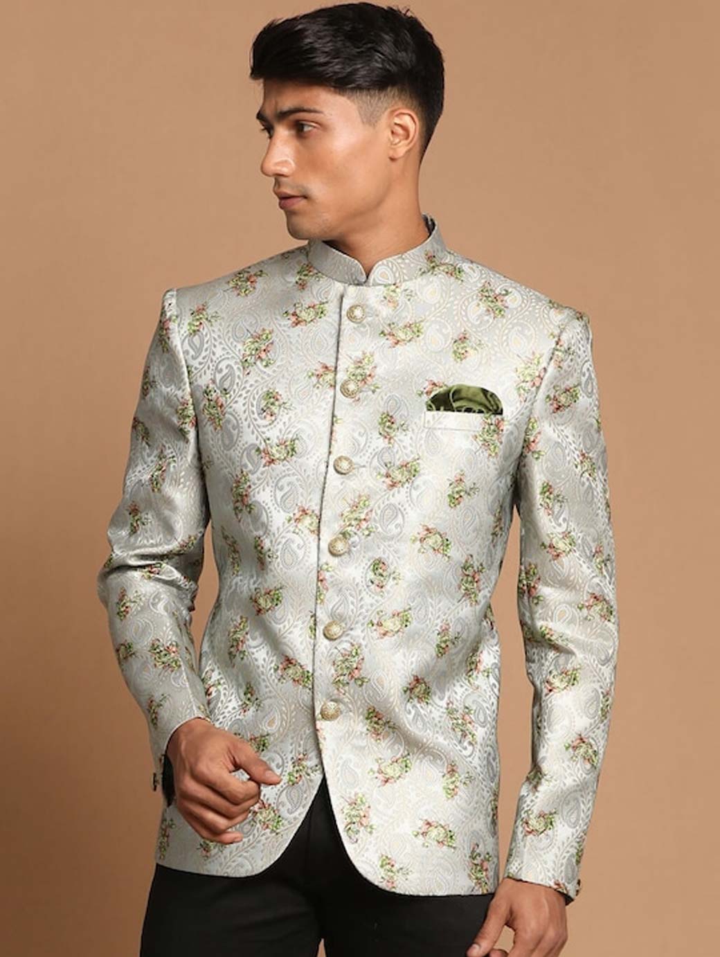 Green self-design slim-fit bandhgala ethnic blazer, has a mandarin collar, long sleeves, full button placket, two flap pockets, and one chest welt pocket and a double-vented back hem