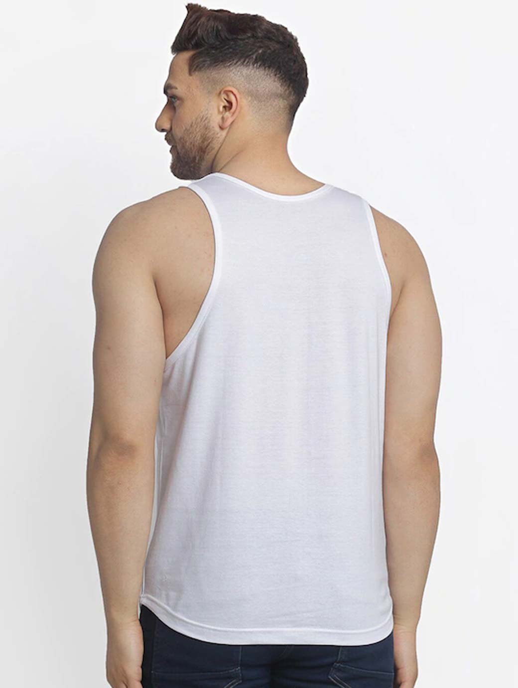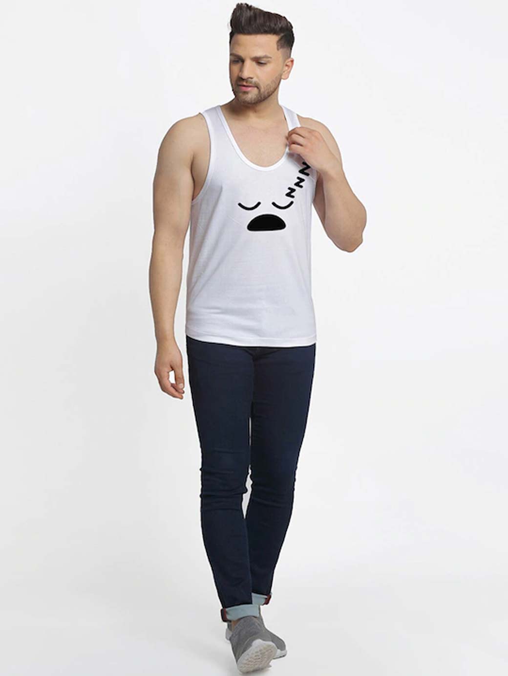 Printed innerwear gym vests White and black sleepy printed innerwear vest, has a round neck, sleeveless White and grey printed innerwear vest, has a round neck, sleeveless