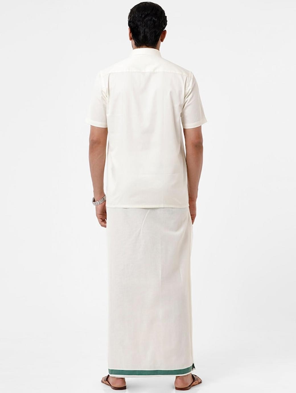 White solid mid-rise dhoti, has a green border