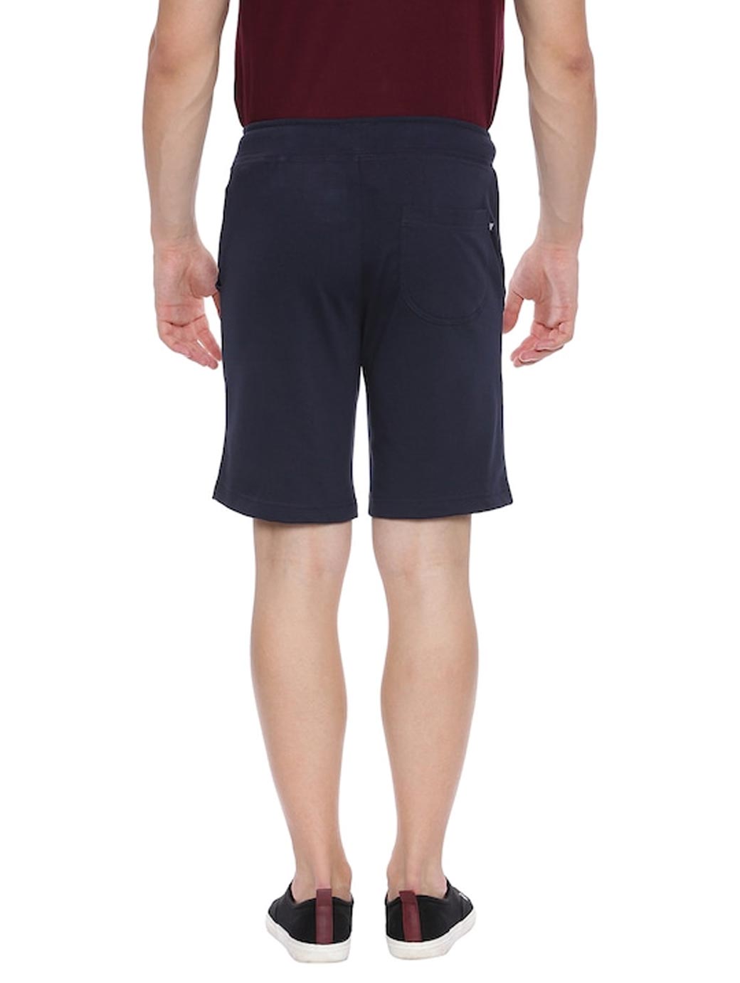 Navy blue knitted mid-rise lounge shorts, has three pockets, an elasticated waistband with drawstring fastening