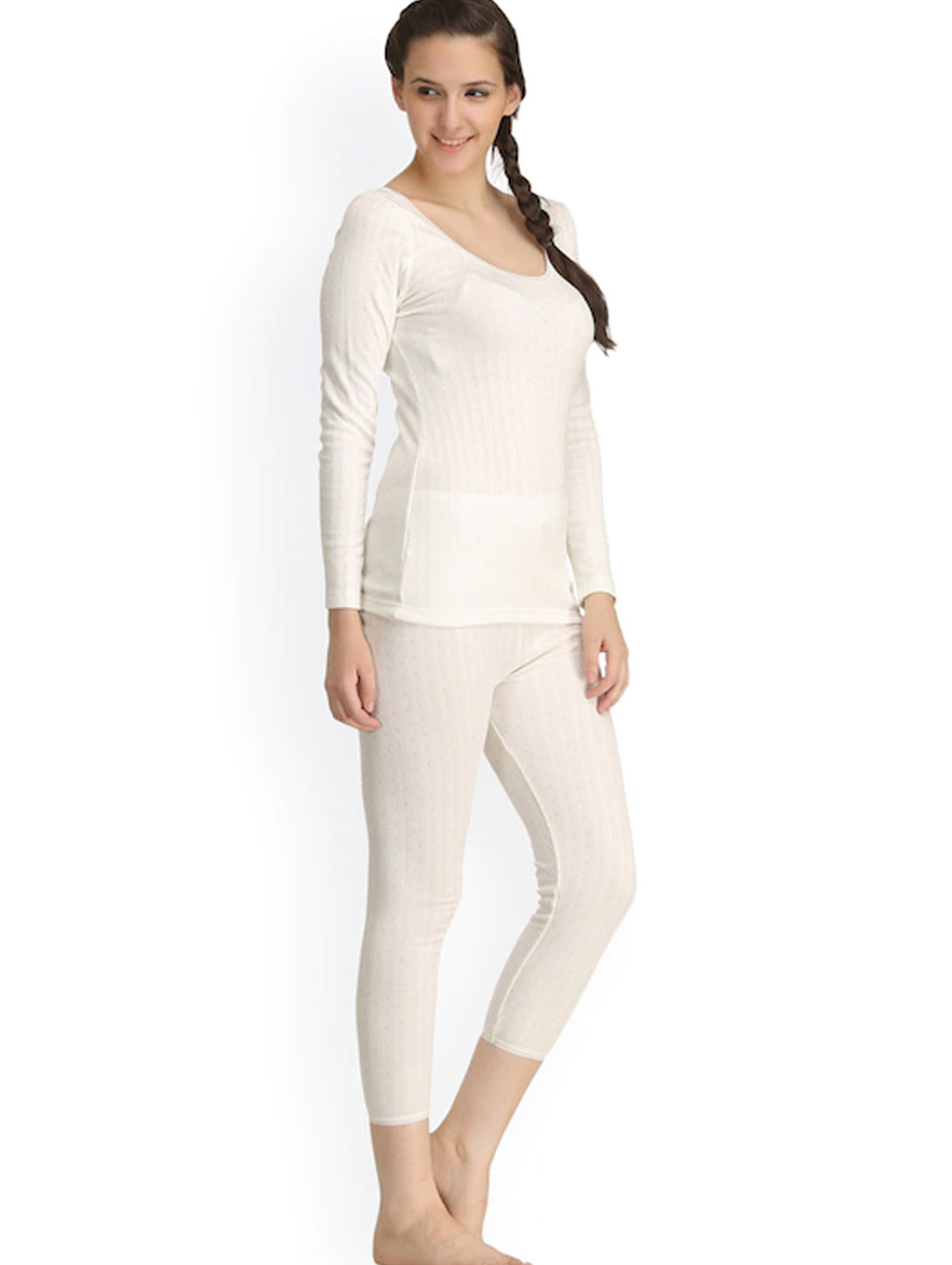 Off-white mid-rise three-fourth thermal leggings in a patterned weave, has an elasticated waistband, elasticated at the hems