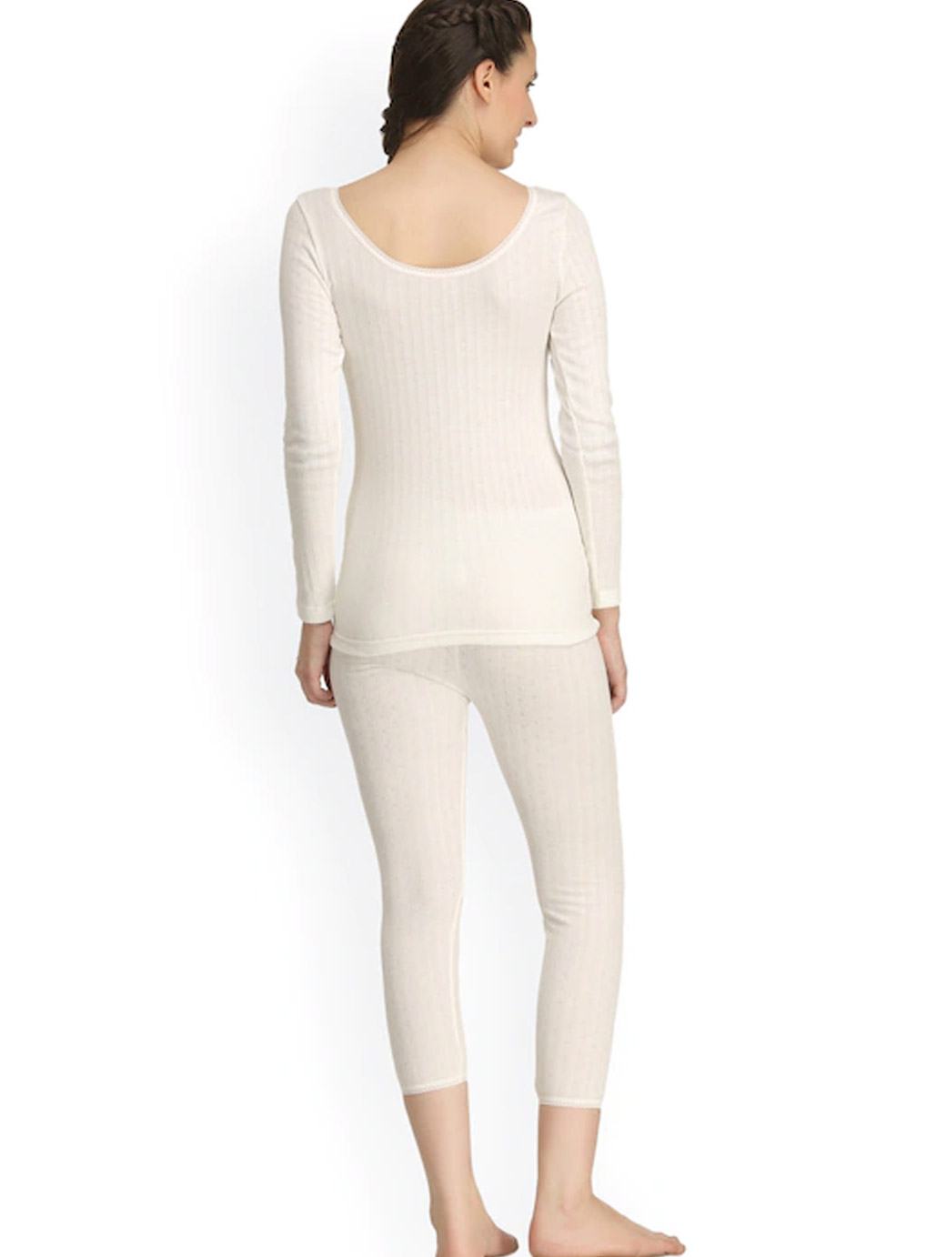 Off-white knitted thermal top in a patterned weave, long sleeves