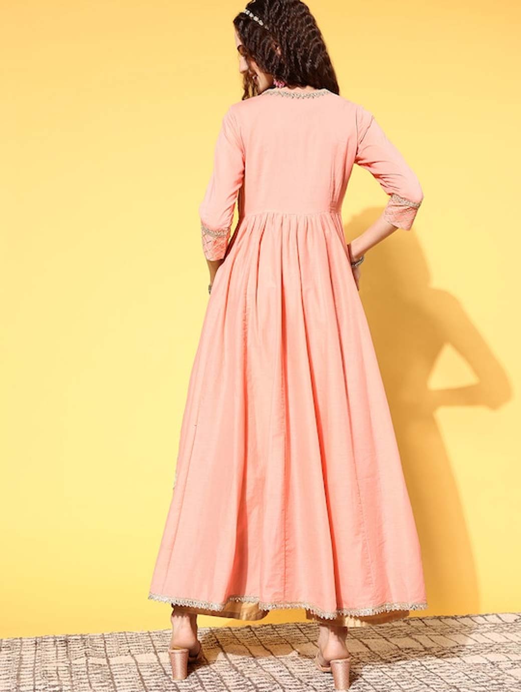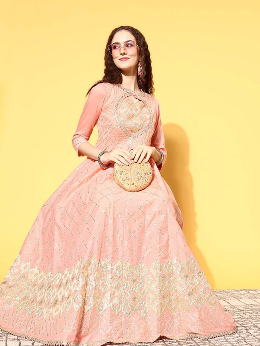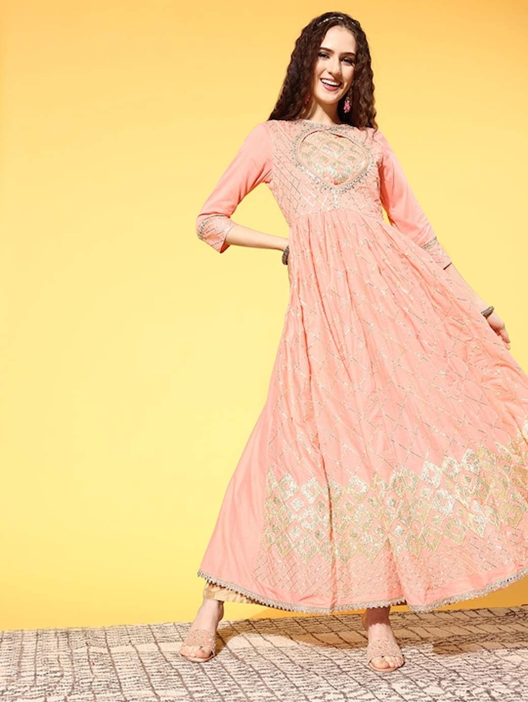 It sports lovely three-quarter regular sleeves and a classy flared hemline to lend a gorgeous look. Beautiful peach shade Three-quarter regular sleeves Flared hemline Ankle length Cotton, dry clean Trend Alert Ensembles adorned with glittery embellishments, like sequins or metallic sheen, to lend you a festive vibe. They are paired with uber-stylish detailing, such as spaghetti straps, tiering, wide necklines, pleats, belted details, etc.