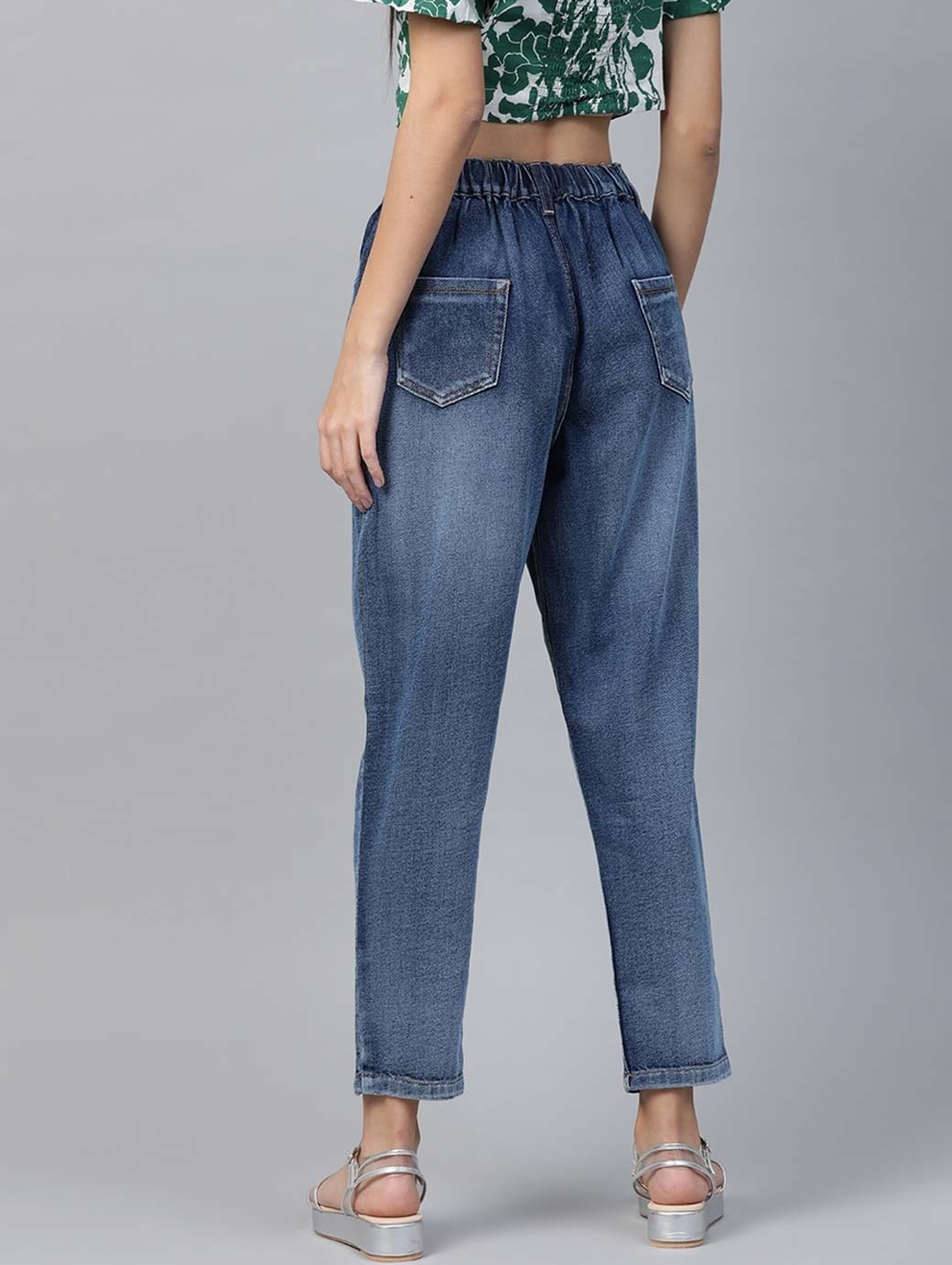 Blue medium wash 5-pocket high-rise cropped jeans, clean look, light fade, has a button and zip closure, and waistband with belt loop
