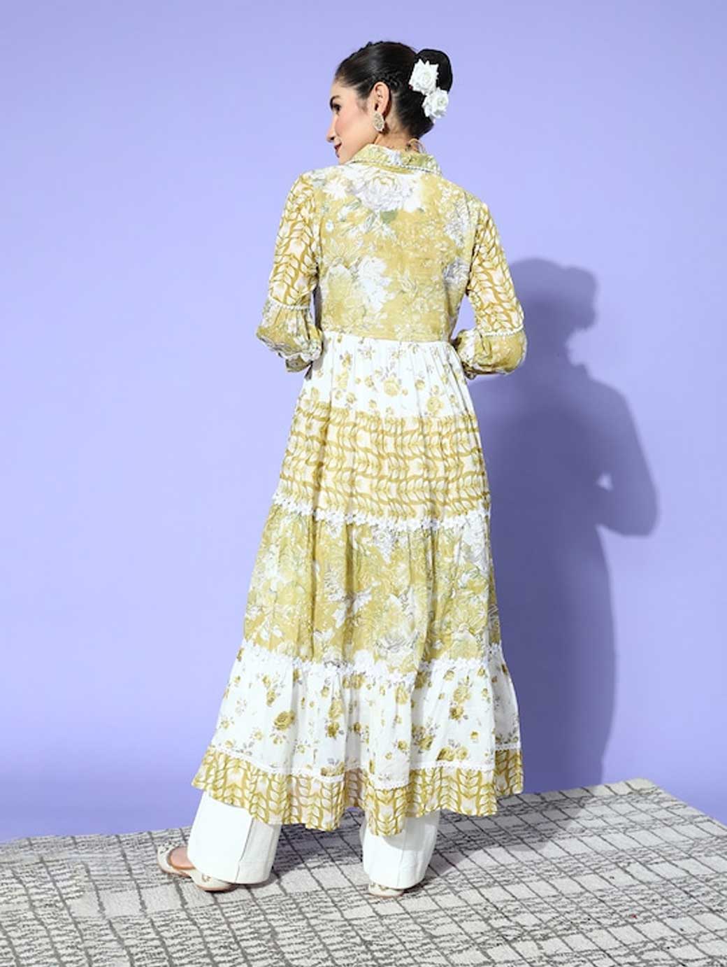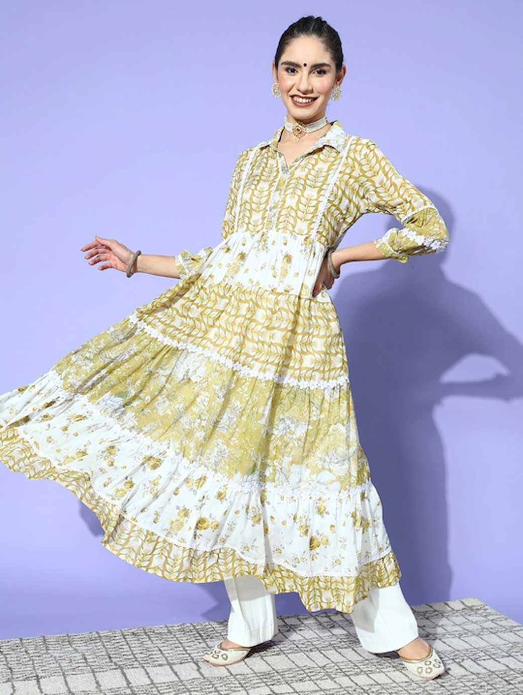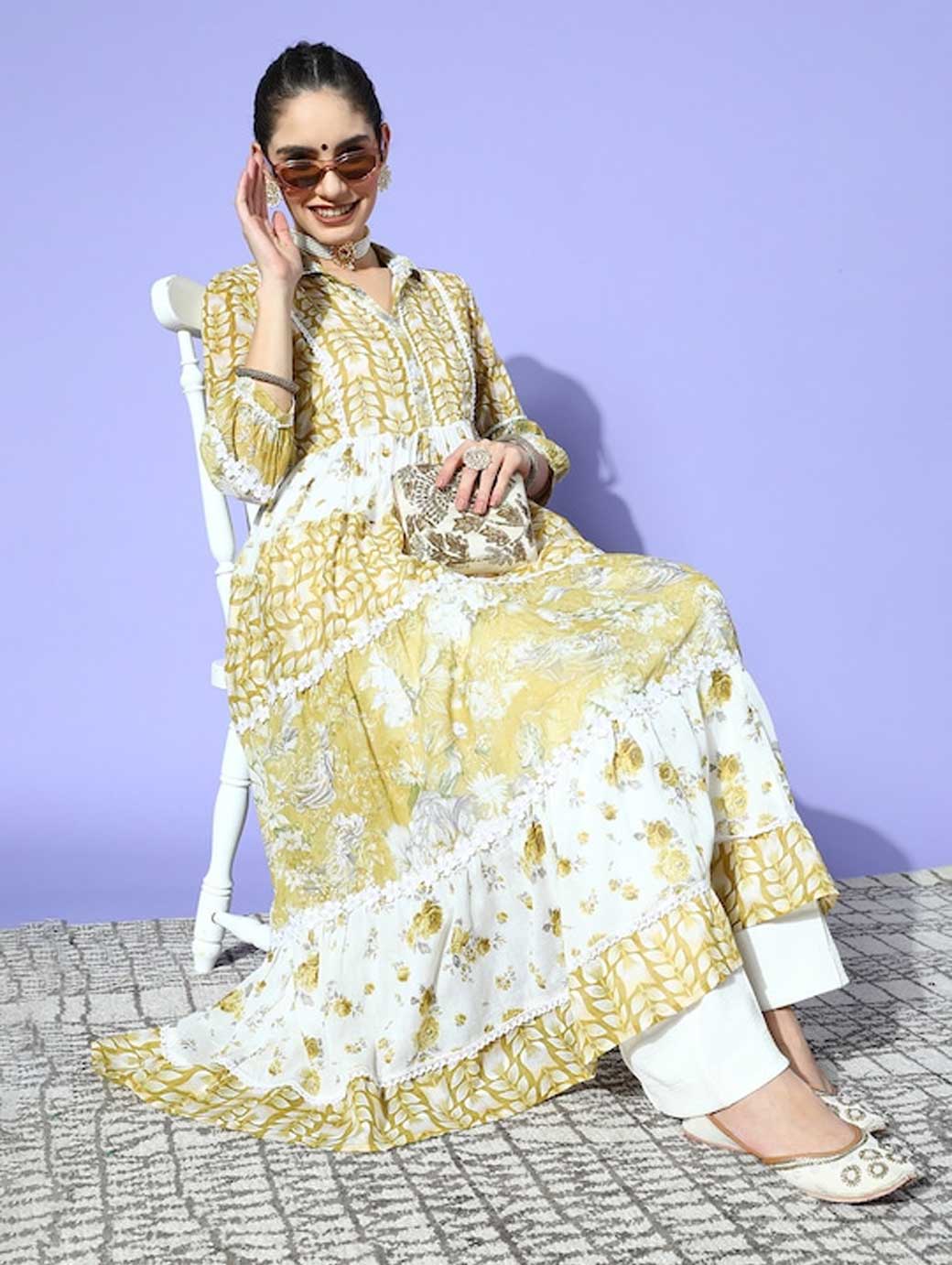 Become a trendsetter when you walk out of the house in this kurta. Designed with an alluring flared hemline and ankle length, this attractive kurta will lend you a traditional look. Elegant olive shade Three-quarter puff sleeves Flared hemline Ankle length Cotton, trend is a mix of whimsical and playful femininity. It plays with beautiful prints and patterns, such as floral, pastel colour-blocking, embroidered