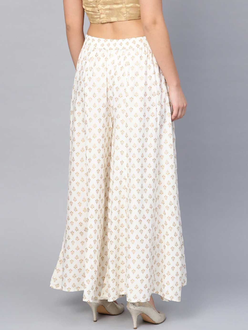 A pair of Off-white and golden printed woven flared Palazzos, has a partially elasticated waistband, opaque, 1 pocket
