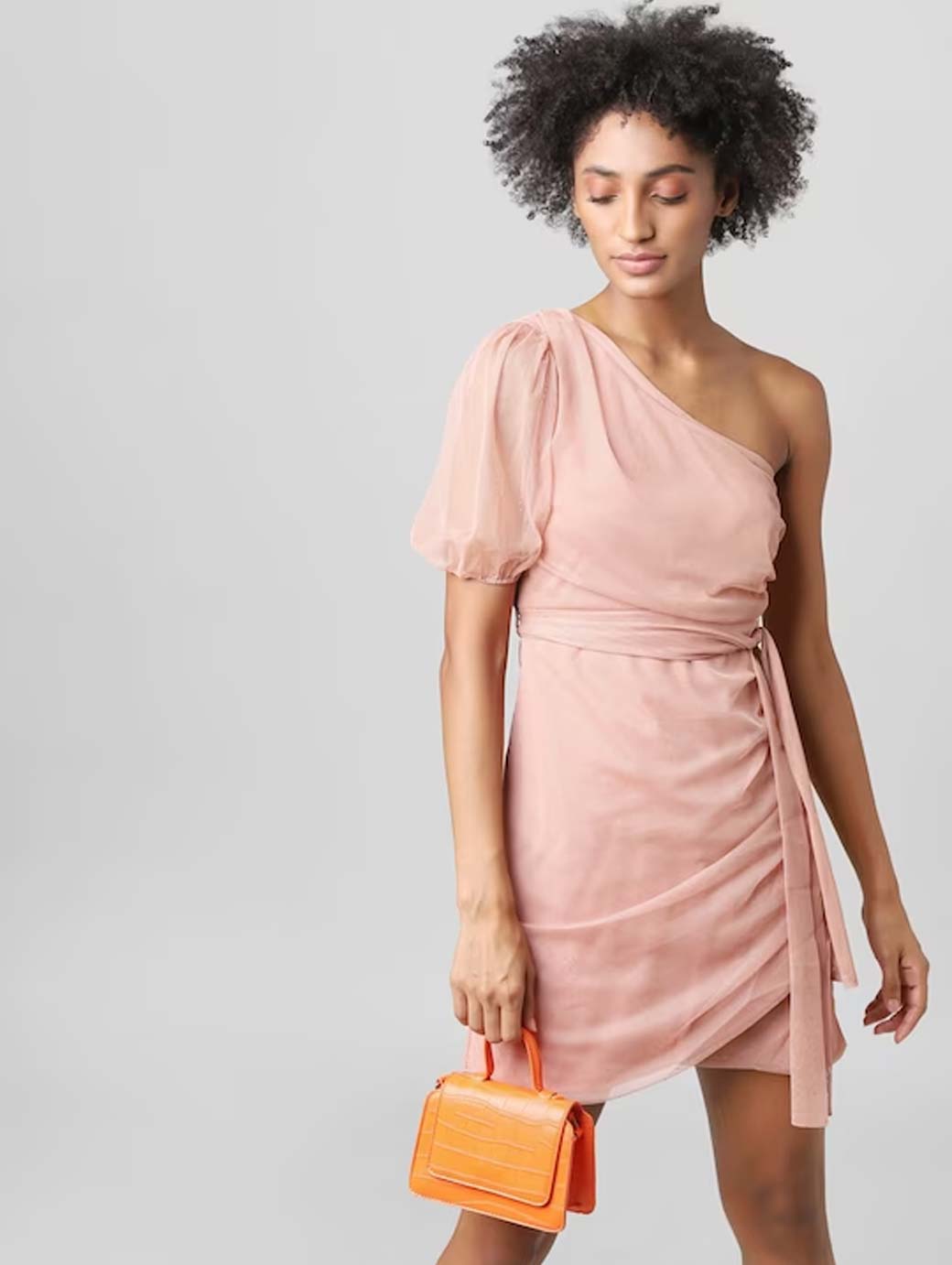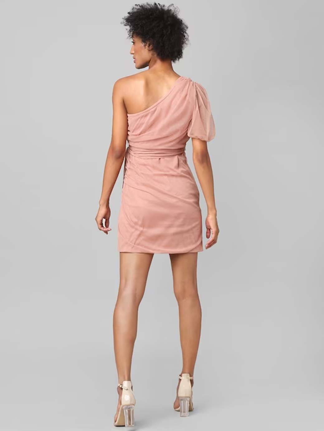 Pink solid mini sheath dress, One shoulder, Short, flutter sleeve, Above knee length in straight hem, Zip closure.
