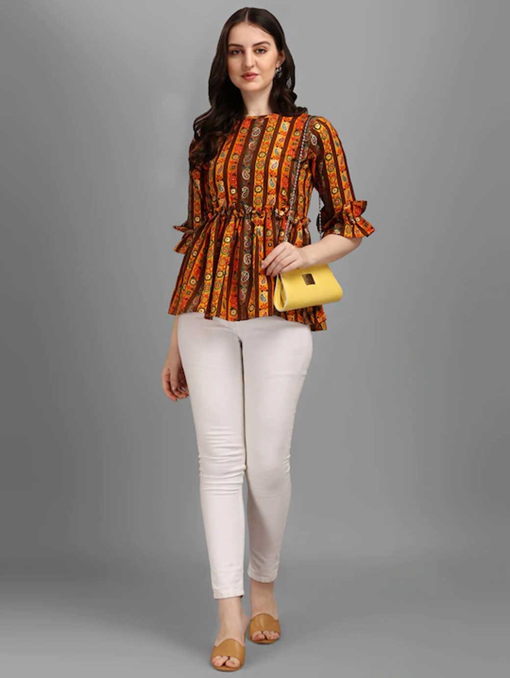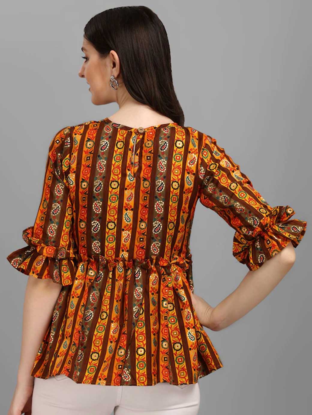 Yellow and brown regular waist top, Ethnic motifs print, Boat neck, short, bell sleeve sleeves, Knitted.